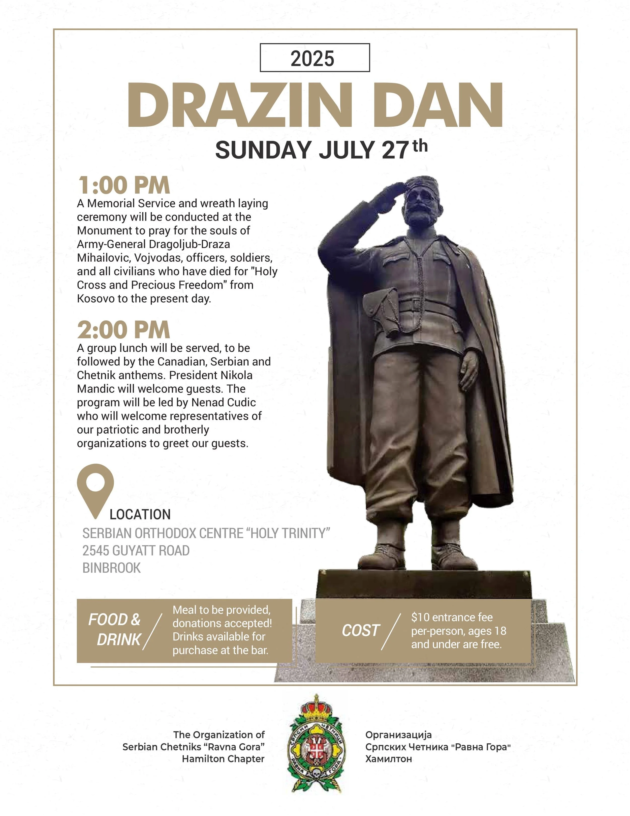 DRAZIN DAN Sunday, July 27, 2025 11:00 a.m. 8:00 p.m. SERBIAN ORTHODOX CENTRE “HOLY TRINITY” 2545 Guyatt Road Hamilton, ON, L0R 1C0 Canada (map) Google Calendar ICS